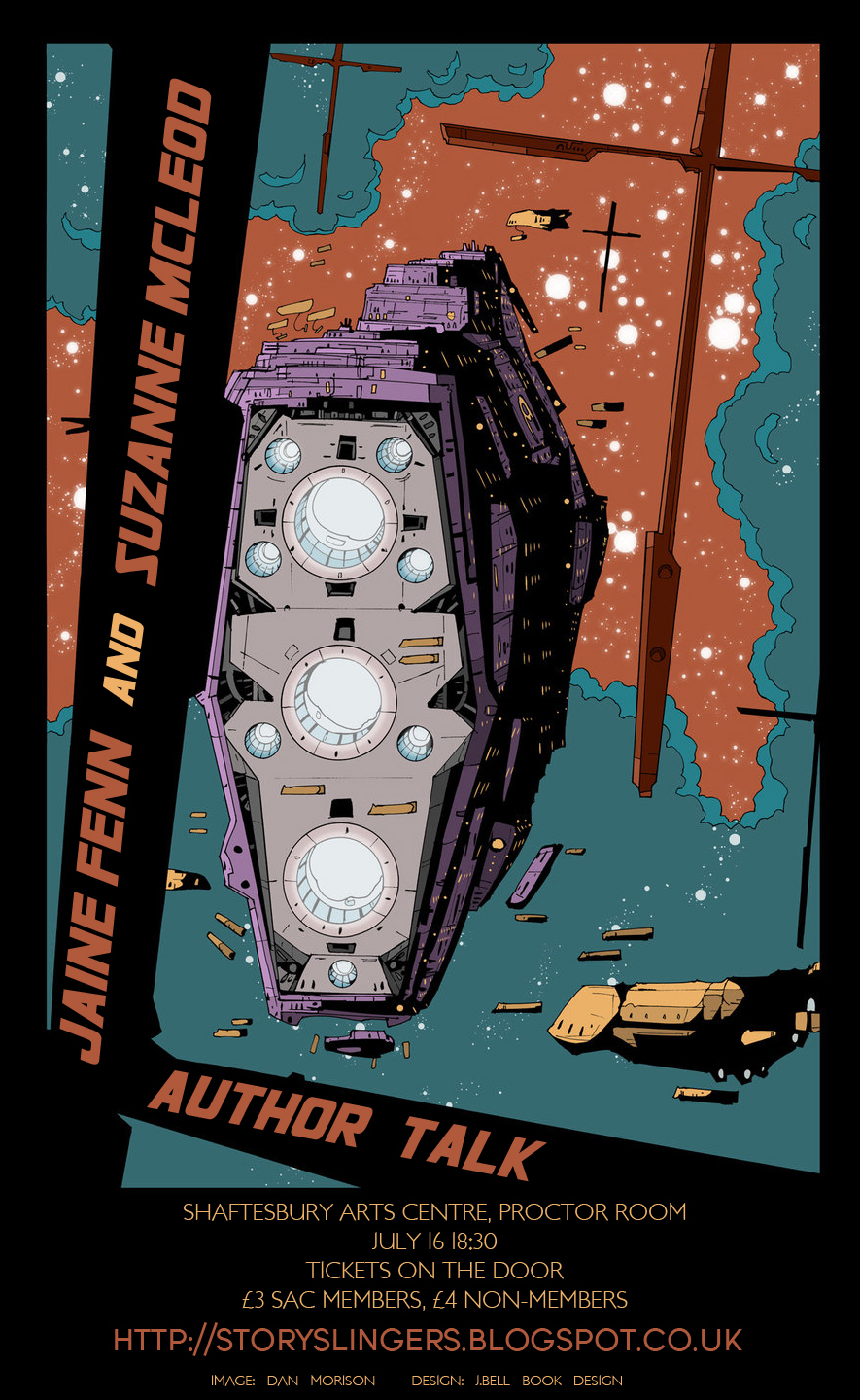In just under two weeks, on Tuesday July 16th, I’ll be a guest of the Storyslingers writers’ group in Shaftesbury, Dorset. I’ll be appearing with Urban Fantasy author Suzanne McLeod at the Shaftesbury Arts Centre at 6.30pm. We’re planning on doing short readings then a fairly informal Q & A. We’ll do our best to live up to the event’s impressive poster.